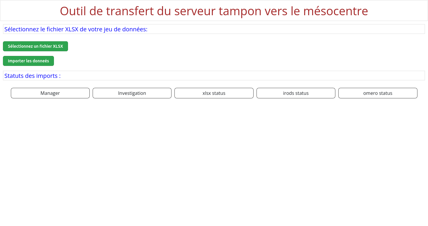 Dans cette rubrique se trouvent toutes les procédures nécessaires à l'importation des données vers le mésocentre, que ce soit de façon indirecte via le serveur tampon, ou de façon directe, via iRODS, vers le mésocentre. Dans tous les cas, vous devrez conclure l'importation en important les métadonnées associées au jeu de données via l'outil spécifique "OMERO Quay Import UI", par fichier XLSX.